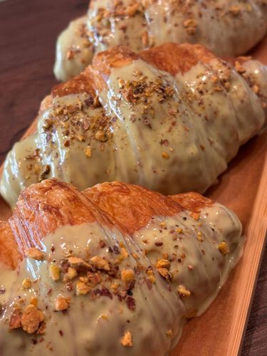 Восхитительный круассан, наполненный изысканным фисташковым кремом и сочным клубничным конфи. Идеальный десерт для ценителей сладостей, сочетает в себе нежное тесто и яркие фруктовые ноты. Подходит для завтрака или в качестве легкого перекуса в любое время дня.