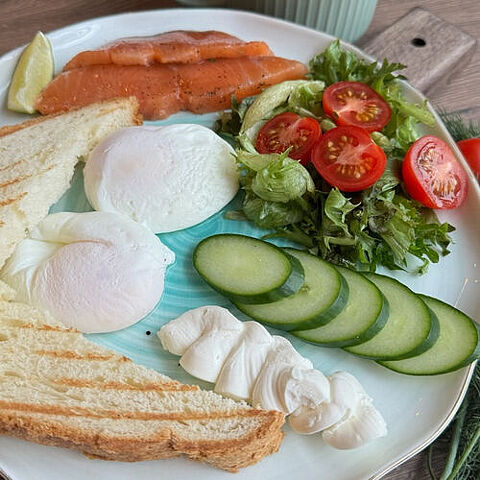 Представьте себе утренний завтрак, который наполняет ваш день свежестью и изысканностью. На тарелке — нежные яйца, приготовленные до совершенства: будь то легкая омлетная текстура или солнечная глазунья с ярким желтком, который словно манит вас к столу. Их мягкость прекрасно сочетается с тонкими ломтиками слабосоленого лосося, который добавляет блюду морской аромат и деликатный вкус. Каждый кусочек рыбы тает во рту, наполняя завтрак нотами изысканности. Рядом с яйцами расположились яркие овощи: хрустящие огурцы, сладкие помидоры, которые не только радуют глаз своей цветовой палитрой, но и придают свежесть и легкость. А щедрая порция зелени — добавляет яркие нотки аромата и делает завтрак еще более аппетитным. И, конечно же, не обойтись без тостового домашнего хлеба! Он подрумянен до идеального состояния: хрустящая корочка скрывает мягкий и воздушный мякиш внутри. Каждый кусочек можно намазать творожным сыром.