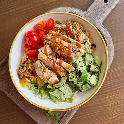 Боул с курицей — это сытное и вкусное блюдо, которое сочетает в себе нежное куриное мясо и свежие овощи. Идеальный выбор для тех, кто предпочитает здоровое питание и разнообразие в своем рационе. Это блюдо подается в удобной тарелке, что позволяет наслаждаться им как дома, так и на вынос.