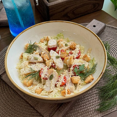 Этот салат представляет собой классическое блюдо, которое включает в себя свежие листья римского салата, хрустящие сухари, нежное куриное филе, пармезан и соус "Цезарь" собственного приготовления. Идеально подходит для легкого обеда или ужина, этот салат сочетает в себе разнообразие текстур и вкусов, что делает его популярным выбором среди любителей здорового питания.