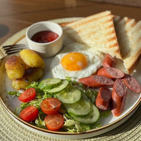 Представьте себе утренний завтрак, который наполняет дом ароматом и теплом. На тарелке — идеально приготовленные яйца, с ярким желтком, который словно приглашает вас к столу. Рядом с ними — аппетитные сосиски на гриле, обжаренные до золотистой корочки. Их сочная текстура и насыщенный вкус создают идеальное сочетание с яйцами. Салат из свежих овощей добавляет яркие акценты: хрустящие огурцы, сладкие помидоры и яркий болгарский перец создают симфонию вкусов и текстур. Каждый кусочек овоща хрустит на зубах, придавая блюду легкость и свежесть. Томатный соус, приготовленный с любовью, добавляет насыщенности и немного остроты. Его бархатистая текстура прекрасно дополняет как яйца, так и сосиски, создавая гармоничное сочетание. И, конечно же, не забудем о тостовом домашнем хлебе! Он подрумянен до идеального состояния: хрустящая корочка обнимает мягкий мякиш внутри. Каждый кусочек можно использовать для того, чтобы собрать все вкусы вместе. Этот завтрак — это не просто еда; это настоящий праздник для ваших чувств. Он дарит заряд энергии на весь день и оставляет приятное послевкусие радости и удовлетворения!