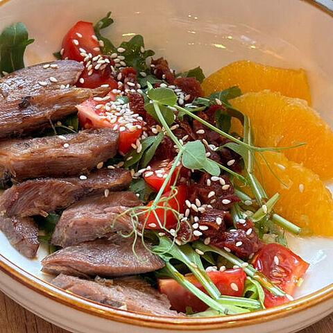 Салат с уткой и апельсинами — это восхитительное сочетание вкусов и текстур. Нежная, сочная утка, обжаренная до золотистой корочки, гармонично дополняется сладкими и кислыми дольками свежих апельсинов. Этот салат не только красив, но и невероятно вкусен, идеально подходит для праздничного стола или романтического ужина. Каждый укус подарит ощущение праздника!