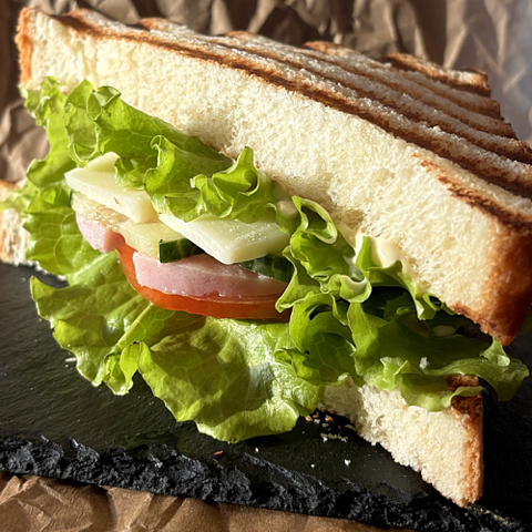 Этот сэндвич с ветчиной — классика вкуса и уютной сытности. Нежная, сочная ветчина мягко сочетается с хрустящим свежим хлебом, создавая гармонию текстур и ароматов.