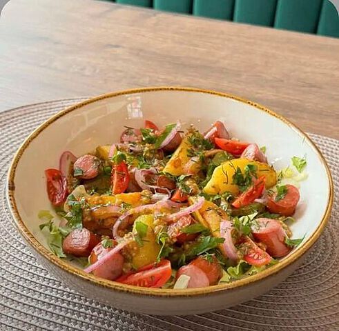 Представьте себе аппетитный салат, в котором каждый ингредиент играет свою уникальную роль, создавая гармоничное сочетание вкусов и текстур. Нежные кусочки отварного картофеля, мягкие и слегка сладковатые, служат основой этого блюда. Они идеально дополняются золотистыми колбасками, обжаренными до хрустящей корочки, которые добавляют насыщенности и пикантности. Этот салат — идеальное сочетание сытности и свежести, которое прекрасно подходит как для обеда, так и для ужина. Он не только радует глаз своей яркой палитрой, но и дарит наслаждение каждому укусу!